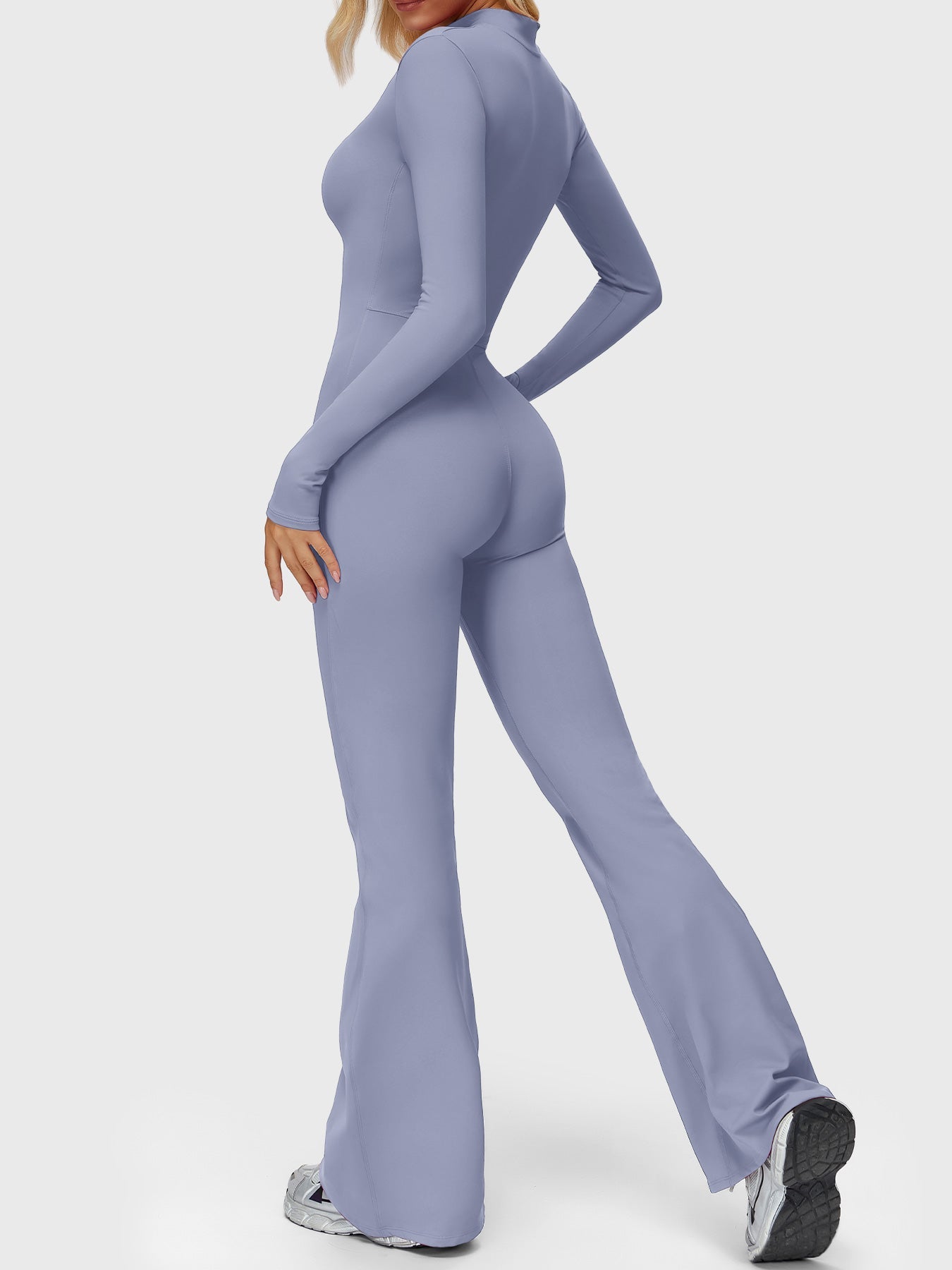 Sculpt, snatch, and stride in the Belle Flared Jumpsuit. Featuring a zip-front mock neck and ultra-flattering flare leg, it elongates your silhouette effortlessly. Crafted from buttery-soft, four-way stretch fabric for all-day wearability.